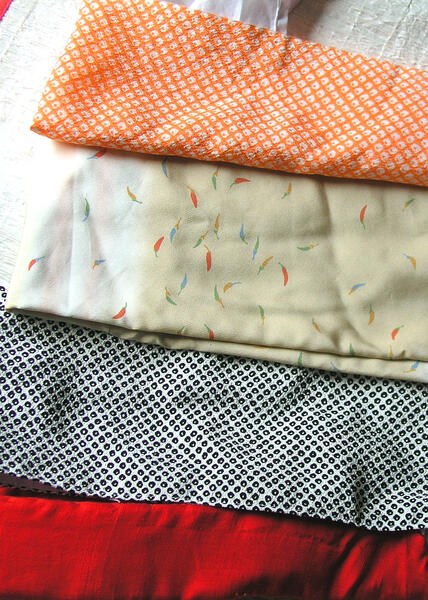 襟の形に並べてあるのは和紙で作った半襟で、このような無地ならどんな色でも合わせられます。ちなみに和紙半襟は粘着テープつきなので縫う手間はなく、洗濯は三回くらいはクリア出来ます。以前、京都で店を開いていたとき、イラストレーターの女性が考案、販売していました。