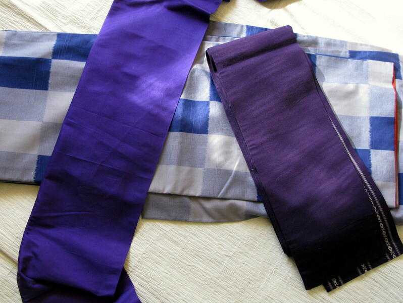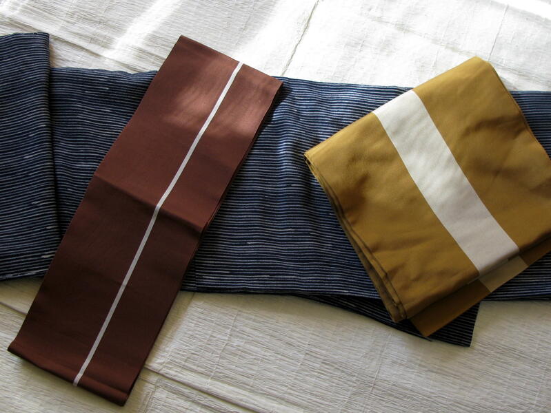 市松、縞、の着物に、同じ系統の色の帯を二本並べたのですが、どうですか、色の強いほうが全体のバランスがよく見えるでしょう?