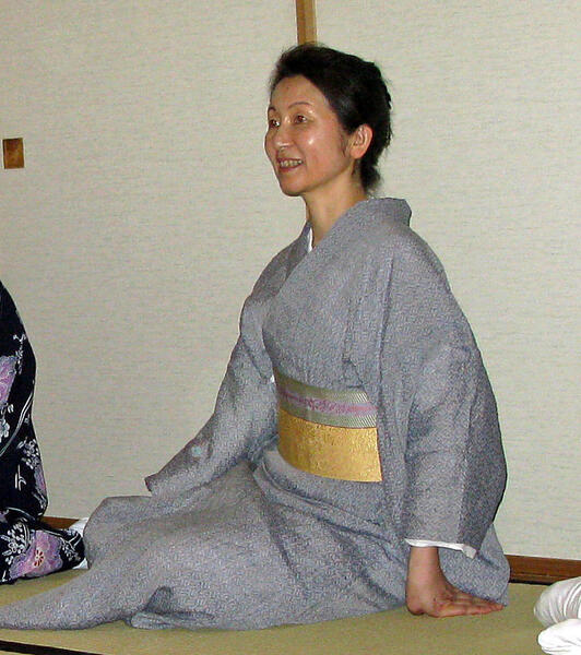 長年の友達で演出家の明神慈は、着物ワークショップで、着物での立ち居振る舞い、仕草を教えています。