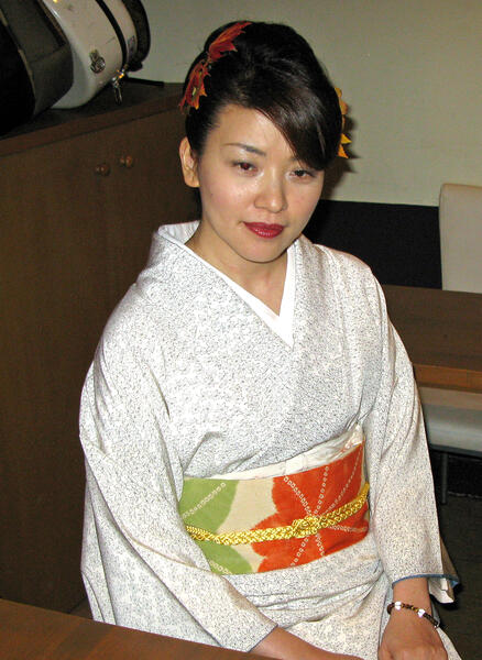 白黒紅葉小紋の着物に紅葉絞りの帯を、「北海歌謡団」ライブ出演の青木リエさんに着せました。髪には本物の紅葉を飾っています。