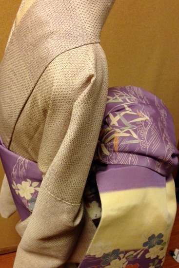 帯は大正時代のものですが、着物は平成のお召しです。ちょっと見えにくいのですが、縮緬半衿は黄色。染めの北川製です。